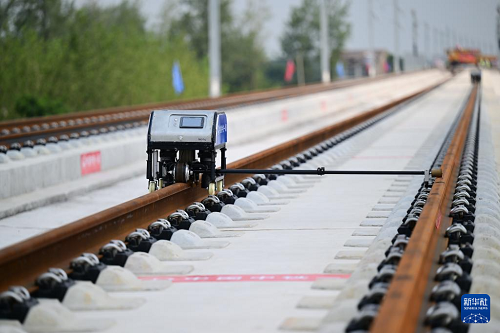 8月6日,智能螺栓機(jī)在淮宿蚌城際鐵路鋪軌施工現(xiàn)場(chǎng)自動(dòng)作業(yè)。(新華社記者 周牧 攝)