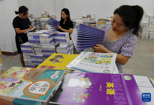 8月14日,河北省石家莊市欒城區(qū)新華書店工作人員在倉(cāng)庫(kù)清點(diǎn)教材。(新華社發(fā) 李明發(fā) 攝)