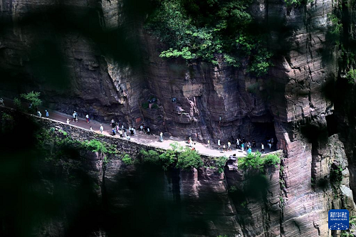 8月16日,游客在河南萬仙山景區(qū)郭亮村“絕壁長廊”上游玩。(新華社記者 朱祥 攝)