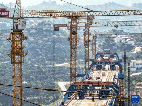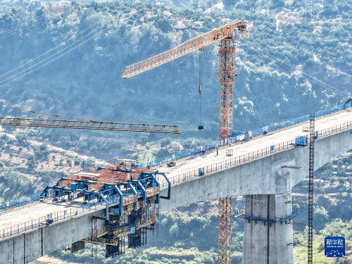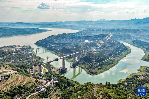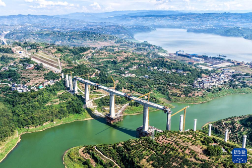 這是8月18日拍攝的渝萬高鐵渠溪河雙線特大橋施工現(xiàn)場(無人機照片)。(新華社記者 唐奕 攝)