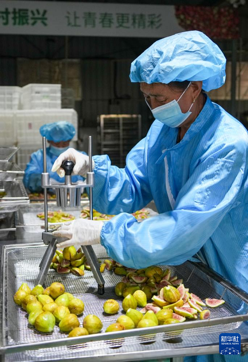 8月24日,在新泰市龍廷鎮(zhèn),一家食品加工企業(yè)的工作人員在生產(chǎn)加工無(wú)花果果干。(新華社記者 徐速繪 攝)