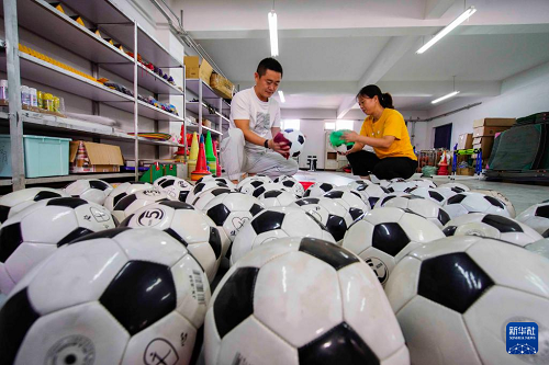 8月25日,河北省遵化市第二中學(xué)體育教師在擦拭整理足球。(新華社發(fā) 劉滿倉 攝)