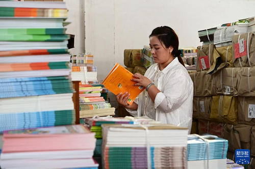 8月25日,工作人員在河北新樂市新華書店倉庫整理清點(diǎn)中小學(xué)教材,準(zhǔn)備送往各學(xué)校。(新華社發(fā) 賈敏杰 攝)