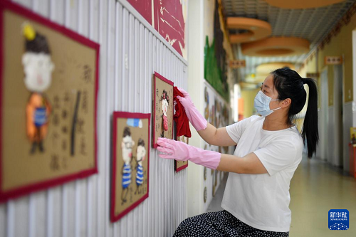 8月25日,山東省青島市嶗山區(qū)金家?guī)X街道中心幼兒園員工在擦拭走廊畫框。(新華社發(fā) 王海濱 攝) 開學(xué)在即,各地積極做好各項(xiàng)準(zhǔn)備工作,家長和孩子紛紛購買學(xué)習(xí)用品,迎接新學(xué)期。 (責(zé)任編輯:蔡文斌) |