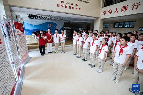 9月4日,北京師范大學南湖附屬學校的老師在給學生們講解“致敬禾城鐵血·同輝國旗榮光”——嘉興市新四軍老戰(zhàn)士抗戰(zhàn)英勇事跡圖版巡展的英雄事跡。(新華社記者 徐昱 攝)