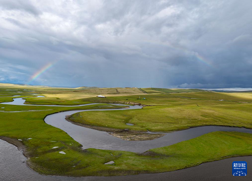 9月14日在內(nèi)蒙古呼倫貝爾市陳巴爾虎旗拍攝的彩虹下的莫爾格勒河(無人機(jī)照片)。(新華社記者 馬金瑞 攝)