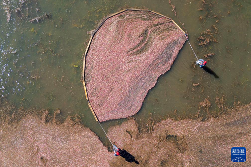 9月21日,在撫遠市蔓越莓種植基地,工作人員在水中采收蔓越莓(無人機照片)。(新華社記者 張濤 攝)