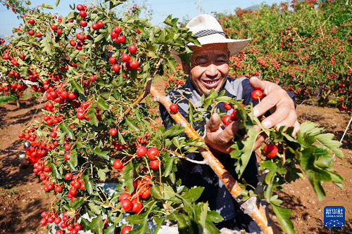 9月25日,在新泰市劉杜鎮(zhèn),果農(nóng)在采摘山楂。(新華社記者 徐速繪 攝)