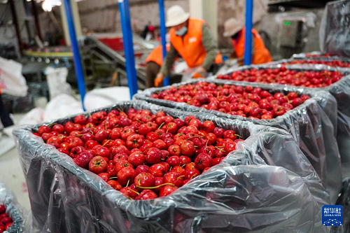 9月25日,在新泰市劉杜鎮(zhèn),經(jīng)過分級的山楂被裝入包裝箱。(新華社記者 徐速繪 攝)