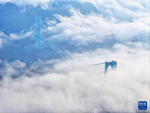 9月28日拍攝的云霧中的貴州花江峽谷大橋(無人機(jī)照片)。(新華社記者 劉續(xù) 攝)