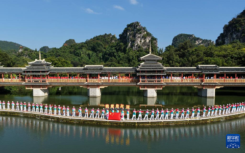 9月28日,在廣西柳州市龍?zhí)豆珗@,人們共同唱響《我和我的祖國(guó)》(無人機(jī)照片)。(新華社發(fā) 黎寒池 攝)