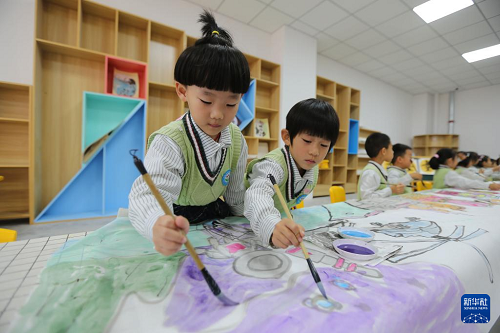 9月28日,甘肅省定西市安定區(qū)幼兒園的小朋友在繪制《我愛你中國(guó)》長(zhǎng)卷。(新華社發(fā) 王克賢 攝)