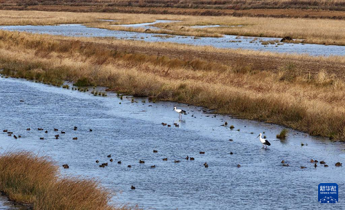 10月14日在黑龍江省同江市三江口國(guó)家濕地公園拍攝的東方白鸛和野鴨(無人機(jī)照片)。(新華社發(fā) 劉萬(wàn)平 攝)