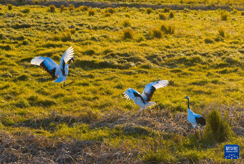 10月9日,在黑龍江撓力河國(guó)家級(jí)自然保護(hù)區(qū),丹頂鶴在濕地中活動(dòng)(無人機(jī)照片)。(新華社發(fā) 韓陽(yáng) 攝)
