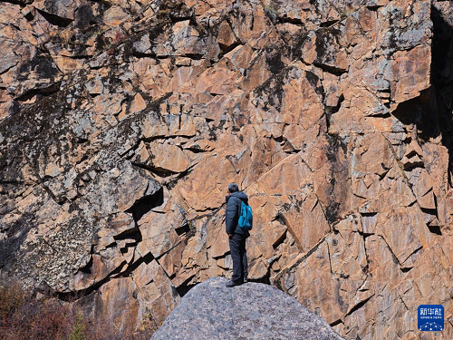 10月21日,陳雪松在實地調(diào)查海子山老林溝拉托扎巖畫。該處巖畫位于海子山南側(cè)老林溝內(nèi),巖畫由小型鹿圖案、三角形以及X型符號組成。(新華社記者 薛晨 攝)