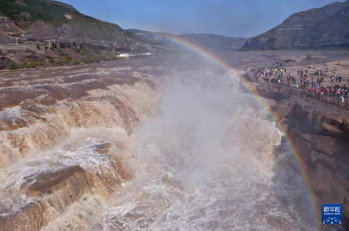 10月27日,位于山西吉縣和陜西宜川縣交界的黃河壺口瀑布景區(qū)天氣晴好,飛濺的水霧在陽光照射下,形成一道壯美的“彩虹橋”。