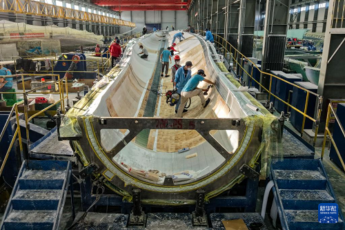11月20日,在甘肅省酒泉經(jīng)濟(jì)技術(shù)開發(fā)區(qū)的甘肅九鼎風(fēng)電復(fù)合材料有限公司成型車間,工作人員進(jìn)行風(fēng)機葉片鋪層作業(yè)(無人機照片)。(新華社記者 郎兵兵 攝)