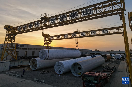 11月20日,在甘肅省酒泉經(jīng)濟(jì)技術(shù)開發(fā)區(qū)的中國水電四局(酒泉)新能源裝備有限公司裝運生產(chǎn)線上,工作人員進(jìn)行風(fēng)機塔筒吊裝作業(yè)(無人機照片)。(新華社記者 郎兵兵 攝)
