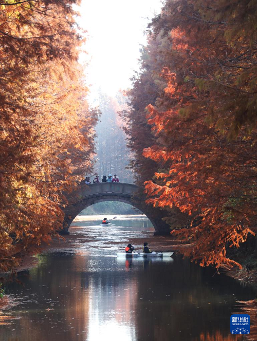 12月14日,人們?cè)谡憬幉ㄖ参飯@水杉林中揮槳戲水,樂(lè)享冬日暖陽(yáng)(無(wú)人機(jī)照片)。(新華社發(fā) 胡學(xué)軍 攝)