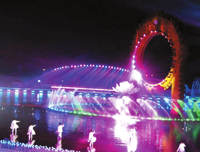 順著公園主入口一直向前走,可直達(dá)核心景觀湖廣場。這是整個園區(qū)的亮點(diǎn),也是夜晚吸引游人增多的原因:觀看晚八點(diǎn)音樂噴泉和水幕電影。夜色朦朧,華燈初上,當(dāng)音樂響起,水柱和燈光齊齊射向星空,噴泉伴隨著時而舒緩、時而動感的音樂起伏跳躍,五彩繽紛的燈光在水柱上變換著不同顏色。當(dāng)“魅力忻州歡迎您”和“遺山公園”的字樣在水幕上出現(xiàn)時,人群中爆發(fā)出陣陣驚嘆,紛紛拿出手機(jī)拍攝這美好畫面,并通過網(wǎng)絡(luò)分享給更多的人。噴泉匯集音樂、水幕、投影、全彩激光、3D影像、焰火等現(xiàn)代先進(jìn)聲光電技術(shù),以水為筆、以光為墨、以音為符,勾畫出一幅幅藝術(shù)畫面,營造出如夢如幻的水上世界。