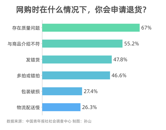 在“3·15國(guó)際消費(fèi)者權(quán)益日”到來之際,中國(guó)青年報(bào)社社會(huì)調(diào)查中心聯(lián)合問卷網(wǎng)(wenjuan.com),對(duì)1531名受訪者進(jìn)行的一項(xiàng)調(diào)查顯示,存在質(zhì)量問題(67.0%)是受訪者退貨的主要情況,然后是與商品介紹不符(55.2%)。59.4%的受訪者感覺在網(wǎng)購(gòu)?fù)素浬洗嬖诹鞒谭爆嵉膯栴}。