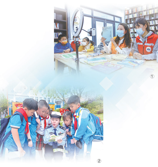 圖①:江蘇省如皋市如城街道聯(lián)合愛行動實踐中心,走進當?shù)仡櫱f社區(qū)農(nóng)家書屋,通過“線上+線下”方式開展“愛閱護苗”主題公益課堂活動。圖為志愿者通過網(wǎng)絡平臺為學生推薦好書。