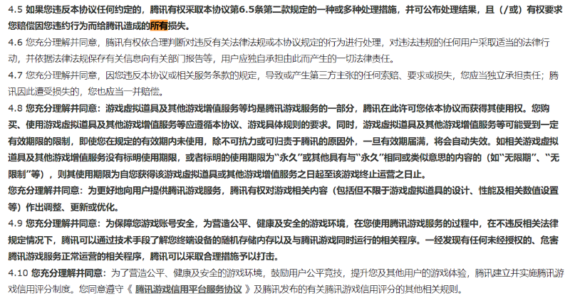 所有網(wǎng)游初次進入游戲都會看到一份密密麻麻的游戲服務(wù)協(xié)議,用戶不同意則不能享受游戲內(nèi)容,包括騰訊在內(nèi)運營商為什么都這么做?因為國家規(guī)定。根據(jù)《網(wǎng)絡(luò)安全法》《互聯(lián)網(wǎng)信息服務(wù)管理辦法》《互聯(lián)網(wǎng)用戶賬號信息管理規(guī)定》,互聯(lián)網(wǎng)信息服務(wù)提供者應(yīng)當(dāng)依照法律法規(guī)有關(guān)規(guī)定,制定和公開互聯(lián)網(wǎng)用戶賬號管理規(guī)則、平臺公約,與用戶簽訂服務(wù)協(xié)議,明確賬號信息注冊、使用和管理相關(guān)權(quán)利義務(wù)。玩家使用賬號如果違反法律法規(guī)、用戶協(xié)議的,互聯(lián)網(wǎng)信息服務(wù)提供者有權(quán)采取警示提醒、限期改正、限制賬號功能、暫停使用、關(guān)閉賬號、禁止重新注冊等處置措施。