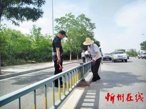 圖為6月5日下午,市交警支隊交通設(shè)施大隊正在更換破損護欄底座。