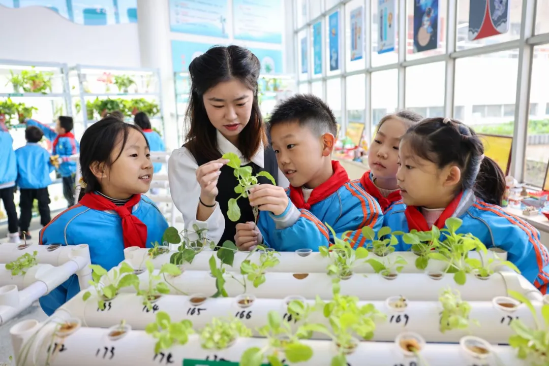 2024年11月21日,在湖北省襄陽(yáng)市大慶路小學(xué)“校園農(nóng)場(chǎng)”,老師正在講解水培植物的相關(guān)知識(shí)。聶志鵬 付小方 攝