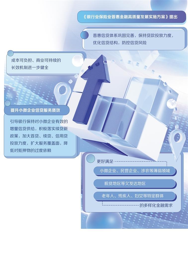 近年來,我國普惠金融發(fā)展取得長足進步,金融服務的普惠性不斷提升。近期印發(fā)的《銀行業(yè)保險業(yè)普惠金融高質量發(fā)展實施方案》(以下簡稱《實施方案》)在主要目標中提出,普惠信貸體系鞏固完善,保持貸款投放力度,優(yōu)化信貸結構,防控信貸風險,成本可負擔、商業(yè)可持續(xù)的長效機制進一步健全,更好滿足小微企業(yè)、民營企業(yè)、涉農等薄弱領域,脫貧地區(qū)等欠發(fā)達地區(qū)以及老年人、殘疾人、婦女等特定群體的多樣化金融需求。