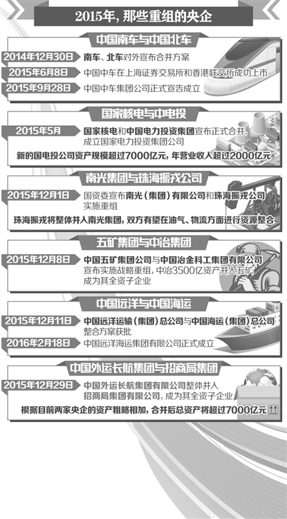 2015年,央業(yè)重組邁出重要步伐。有6對12家企業(yè)完成了重組,涉及至少27家上市公司,一批包括裝備制造、能源、航運在內(nèi)的央企實現(xiàn)兼并重組,中央企業(yè)也由112家減至106家。2016年以來,繼1月25日中材集團與中建集團發(fā)布公告稱實施戰(zhàn)略重組之后,中國國旅集團與中國港中旅集團也發(fā)布公告稱籌劃戰(zhàn)略重組。此外,中航動力、成發(fā)科技、中航動控三家公司則于日前發(fā)布重組公告。離國務院國資委直接監(jiān)管的中央企業(yè)數(shù)量減至100家僅有“一步之遙”。