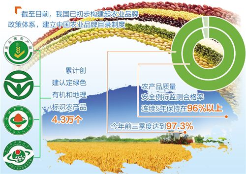 “中國農(nóng)業(yè)品牌正駛?cè)肟焖俳】蛋l(fā)展的快車道,成為現(xiàn)代農(nóng)業(yè)發(fā)展的亮麗風(fēng)景?!鞭r(nóng)業(yè)農(nóng)村部部長韓長賦表示,近年來我國大力實(shí)施品牌強(qiáng)農(nóng)戰(zhàn)略,取得了積極成效。截至目前,已初步構(gòu)建起農(nóng)業(yè)品牌政策體系,建立中國農(nóng)業(yè)品牌目錄制度。累計(jì)創(chuàng)建認(rèn)定綠色有機(jī)和地理標(biāo)識農(nóng)產(chǎn)品4.3萬個,形成了一批特色地域名片。品牌化帶動了農(nóng)業(yè)生產(chǎn)標(biāo)準(zhǔn)化,農(nóng)產(chǎn)品質(zhì)量安全例行監(jiān)測合格率連續(xù)5年保持在96%以上,今年前三季度達(dá)到97.3%,更多優(yōu)質(zhì)農(nóng)產(chǎn)品受到消費(fèi)者青睞。