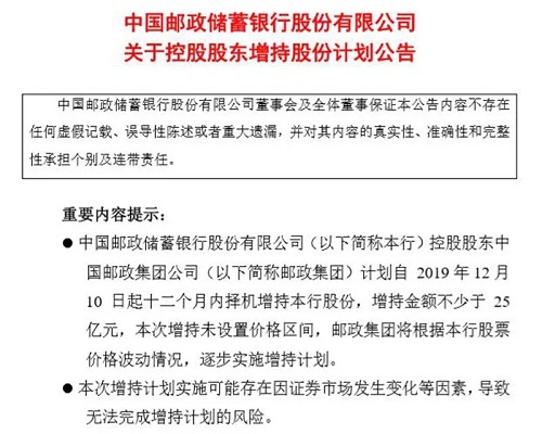 備受市場關(guān)注的是,同日,郵儲銀行還發(fā)布了《關(guān)于控股股東增持股份計(jì)劃公告》。公告稱,控股股東中國郵政集團(tuán)公司(下稱郵政集團(tuán))計(jì)劃自2019年12月10日起12個(gè)月內(nèi)擇機(jī)增持該行A股股份,增持金額不少于25億元。這體現(xiàn)了控股股東對郵儲銀行投資價(jià)值的高度認(rèn)可,也將為證券市場的穩(wěn)定運(yùn)行創(chuàng)造良好環(huán)境,彰顯“國家隊(duì)”擔(dān)當(dāng)。