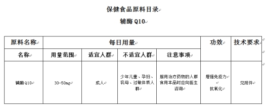 2019年3月,國(guó)家市場(chǎng)監(jiān)管總局發(fā)布《關(guān)于公開(kāi)征求輔酶Q10等5種保健食品原料目錄意見(jiàn)的公告》,將輔酶Q10功效進(jìn)一步收窄為兩點(diǎn):增強(qiáng)免疫力和抗氧化