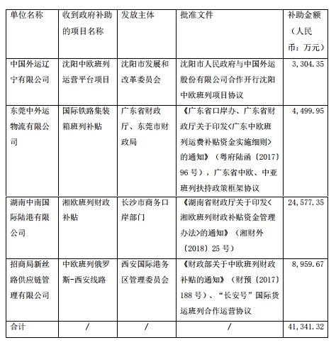 其中,中國(guó)外運(yùn)在2019年7月-9月期間獲得的超過(guò)500萬(wàn)元人民幣的大額政府補(bǔ)貼項(xiàng)目有:沈陽(yáng)中歐班列運(yùn)營(yíng)平臺(tái)項(xiàng)目獲得補(bǔ)助金額3304.35萬(wàn)元、國(guó)際鐵路集裝箱班列補(bǔ)貼獲得補(bǔ)助金額4499.95萬(wàn)元、湘歐班列財(cái)政補(bǔ)貼獲得補(bǔ)助金額2.46億元、中歐班列俄羅斯-西安線(xiàn)路獲得補(bǔ)助金額8959.67萬(wàn)元。