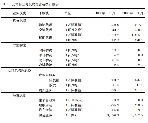 從公司各業(yè)務(wù)板塊運(yùn)營(yíng)情況來(lái)看,2019年1-9月,中國(guó)外運(yùn)各版塊業(yè)務(wù)量同比增幅較小,其中不乏較上年同比下降的情況。例如,貨運(yùn)代理中的空運(yùn)代理、專(zhuān)業(yè)物流中的合同物流、項(xiàng)目物流,倉(cāng)儲(chǔ)及碼頭服務(wù)中的庫(kù)場(chǎng)站服務(wù)散貨、碼頭服務(wù)等具體業(yè)務(wù)的貨運(yùn)量較2018年同期相比均有所下降。