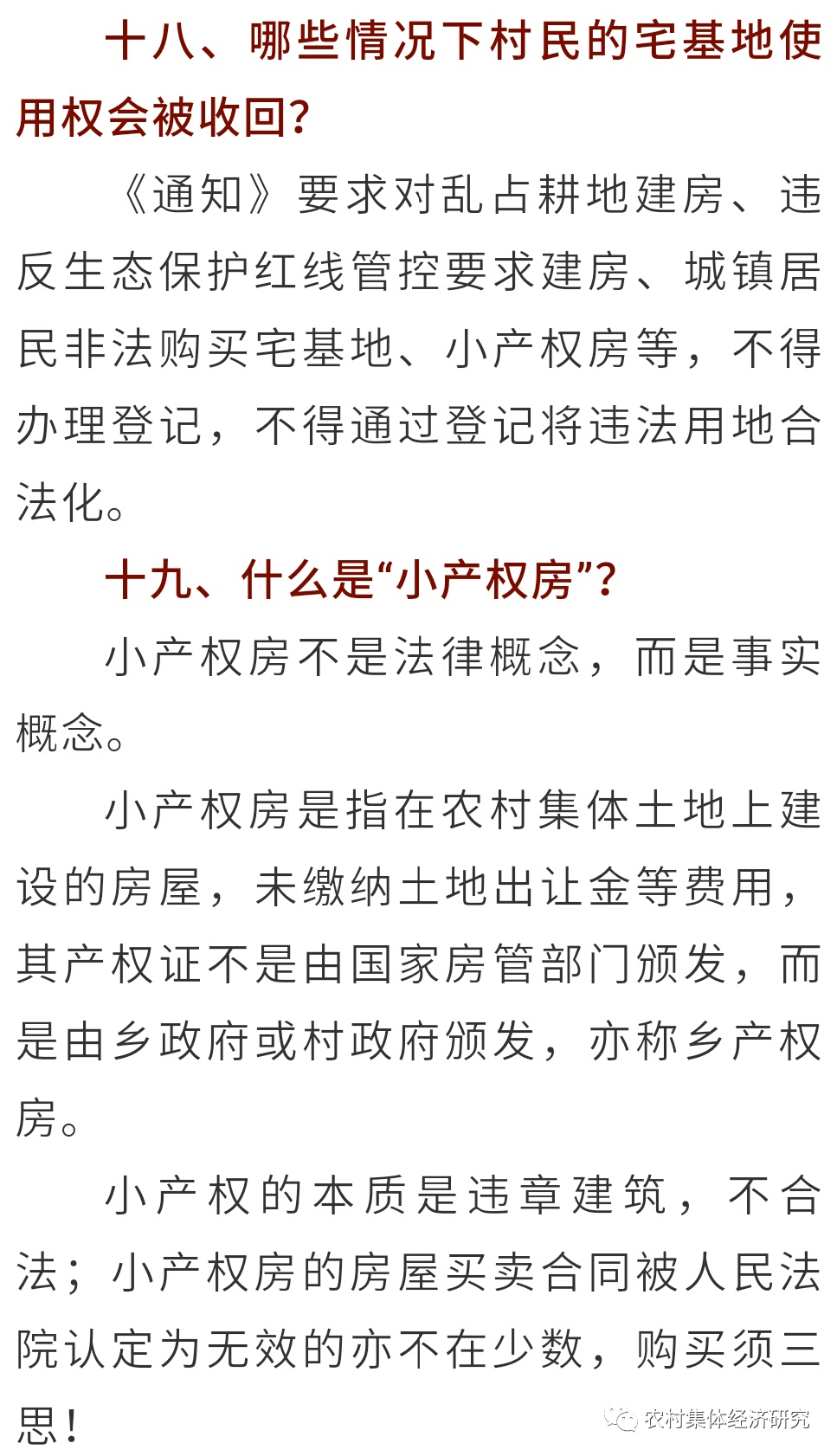 二十、城鎮(zhèn)居民能否到農(nóng)村購置宅基地?不能,《通知》要求,嚴(yán)禁城鎮(zhèn)居民到農(nóng)村購買宅基地,嚴(yán)禁下鄉(xiāng)利用宅基地建設(shè)別墅大院和私人會館,嚴(yán)禁借流轉(zhuǎn)之名違法違規(guī)圈占、買賣宅基地。