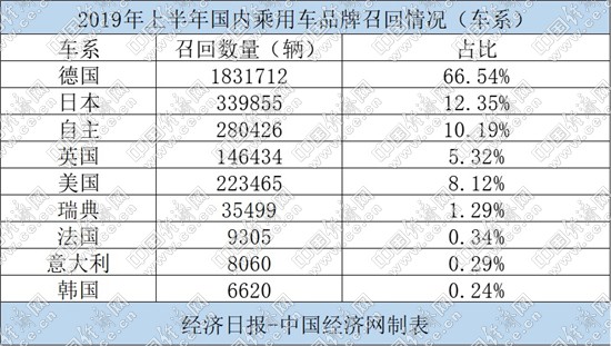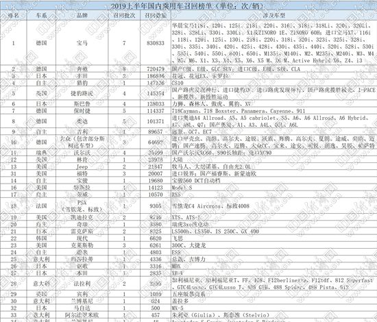 分車(chē)系來(lái)看,上半年,德系品牌成為召回“主力”,1-6月,德系品牌共召回汽車(chē)1831712輛,占召回總量的66.54%,其中寶馬、奔馳分別以830833輛和720479輛的召回?cái)?shù)量,“遙遙領(lǐng)先”其他品牌;而高檔車(chē)、超級(jí)跑車(chē)品牌保時(shí)捷更是召回汽車(chē)114337輛,數(shù)量甚至遠(yuǎn)超其2018年80108輛的銷(xiāo)量總和。