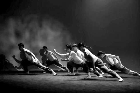 作為舞蹈劇場(chǎng),《凝》的呈現(xiàn)非常先鋒,給人最大的震撼是它沒(méi)有明確的劇情發(fā)展線(xiàn)。大幕開(kāi)啟后,十幾位舞者在舞臺(tái)上站立,用一串不斷重復(fù)、節(jié)奏逐漸變化的馬步開(kāi)啟演出,在前十分鐘左右的時(shí)間里,表演幾乎沒(méi)有背景音樂(lè),間或兩聲鼓聲,抑或是梆子聲,讓舞者變化了節(jié)奏。忽然,舞者向前出拳,展現(xiàn)出快、準(zhǔn)、狠的勁道與爆發(fā)力,呼吸聲與拳風(fēng)都在耳邊。就這樣,《凝》進(jìn)入了武術(shù)與舞蹈交融的世界,或呈現(xiàn)爆發(fā)力,或展現(xiàn)生動(dòng)多姿的招式,或大開(kāi)大合地舒展動(dòng)作,將蔡李佛拳、白鶴拳、洪拳三大派別的武術(shù)招式意象化地展現(xiàn)。