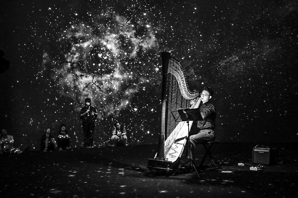 開幕當(dāng)天還舉辦了以“奔赴天文與藝術(shù)的宇宙浪漫”為題的論壇,圍繞展覽中的天文藝術(shù)作品展開討論。時(shí)代美術(shù)館執(zhí)行副館長劉威威表示,展覽通過藝術(shù)化手段、人文關(guān)懷的角度呈現(xiàn)硬核科學(xué)知識(shí),讓公眾更好地認(rèn)知科學(xué),感受宇宙的浪漫。她相信,這樣“詩意的科普”與“科普的詩意”結(jié)合也許是未來科學(xué)藝術(shù)展的趨勢(shì)之一。論壇結(jié)束后,青年豎琴演奏家馬佳杰在星輝斑斕的展廳內(nèi)帶來了精彩的現(xiàn)場(chǎng)音樂會(huì)。展覽將持續(xù)至10月8日。