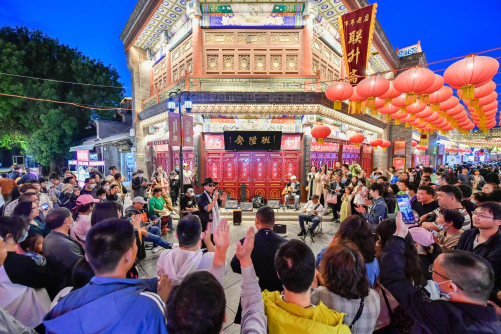 游客在天津古文化街欣賞歌手演唱。新華社記者 孫凡越 攝 穿上具有年代感的服飾,跟著情境體驗(yàn)一場(chǎng)“時(shí)空穿梭之旅”;化身故事里的人物,參與到或驚險(xiǎn)或感人或燒腦的演藝場(chǎng)景……時(shí)下,創(chuàng)新演藝手段打造沉浸式體驗(yàn)是演出市場(chǎng)的熱點(diǎn),觀眾參與劇情,豐富體驗(yàn)感,備受年輕人歡迎。 用餐前從角色盲盒中抽取身份,用餐期間和演員互動(dòng)化身“戲中人”,天津印象城老碼頭餐廳的“一出好戲”近來(lái)吸引了不少客人。大家表示,“這不僅僅是一次用餐,而是一次新潮的消費(fèi)體驗(yàn)?!?/p> 策劃新穎、跨界融合的文化產(chǎn)品進(jìn)一步激活了文化市場(chǎng)的消費(fèi)潛力,也拉動(dòng)天津文商旅消費(fèi)升級(jí)轉(zhuǎn)化。
