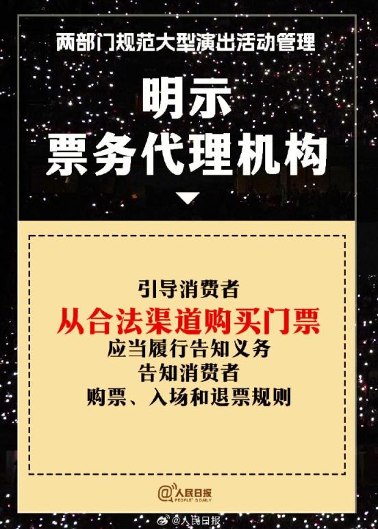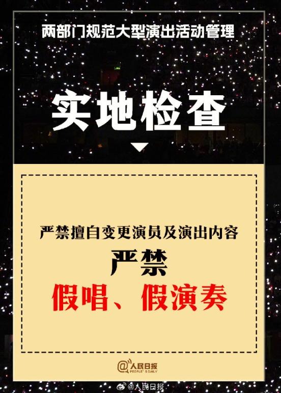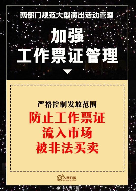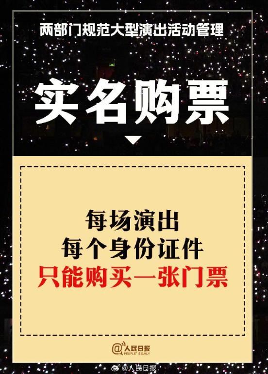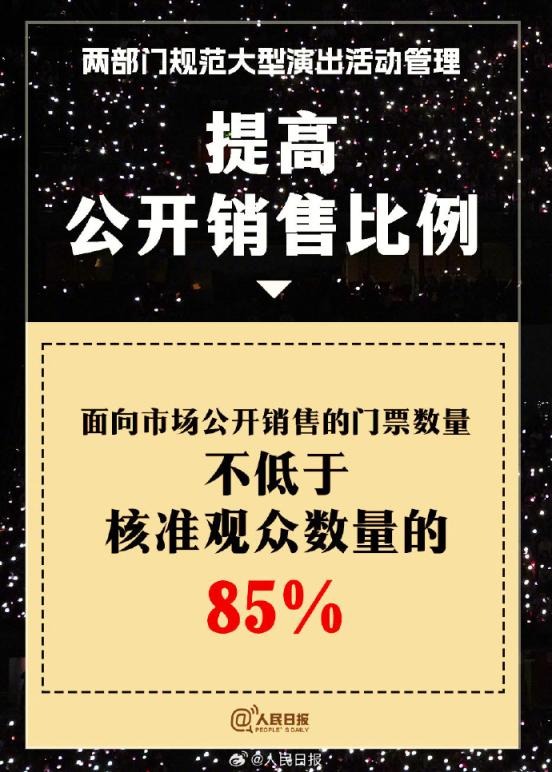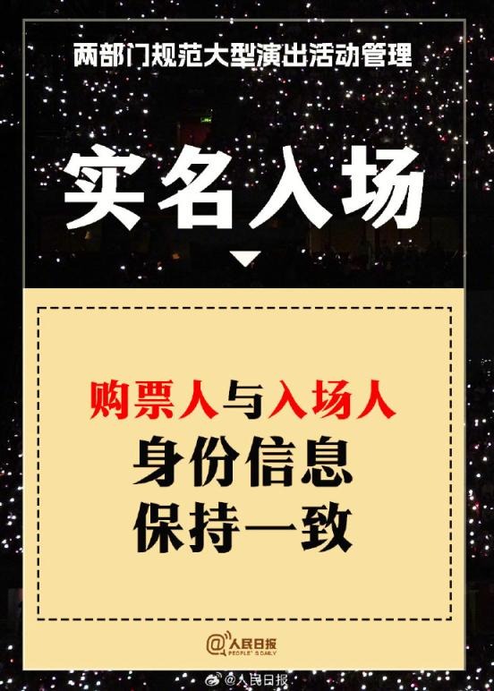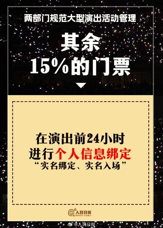 ?兩部門通知:①實名購票、實名入場。5000人以上演唱會購票人和入場人必須一致;②大型演出要設定梯次退票標準;③公開銷售門票不低于核準觀眾數量的85%;④嚴禁假唱、假演奏。更多↓↓↓詳戳,周知!