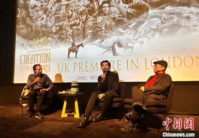 9月17日,中國(guó)電影《封神》(第一部:朝歌風(fēng)云)在倫敦舉辦英國(guó)首映禮,演員費(fèi)翔(中)、美術(shù)指導(dǎo)葉錦添(右)在首映禮上分享創(chuàng)作故事。 中新社記者 歐陽(yáng)開宇 攝
