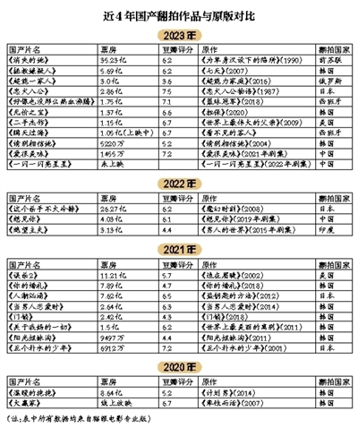 新京報整理了近4年,國產電影的翻拍情況,2023年有11部翻拍片上映,創(chuàng)下近5年數(shù)量之最。今年暑期檔上映的電影《消失的她》以35.23億票房,成為內地影史翻拍片最高票房紀錄保持者。
