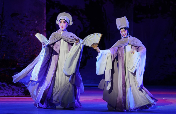 施夏明、單雯兩位昆曲名角的演唱更是爐火純青,動(dòng)人心魄。伴隨著清婉動(dòng)人、中西融合的音樂旋律,在至幻至美的舞臺(tái)上,真摯熾熱的動(dòng)人情感化為婉約優(yōu)美的昆曲曲牌,既充滿了生活的精致與情趣,又超越了塵世的喧囂和煙火之氣。當(dāng)沈復(fù)和蕓娘離別時(shí),悲慟情境隨著唱詞和曲調(diào)的一唱三嘆無限放大,散發(fā)出強(qiáng)大的感染力。而當(dāng)“余韻”尾聲,沈復(fù)和蕓娘攜手走向遠(yuǎn)方,走進(jìn)書中,又留給人們無盡的想象和感動(dòng)。