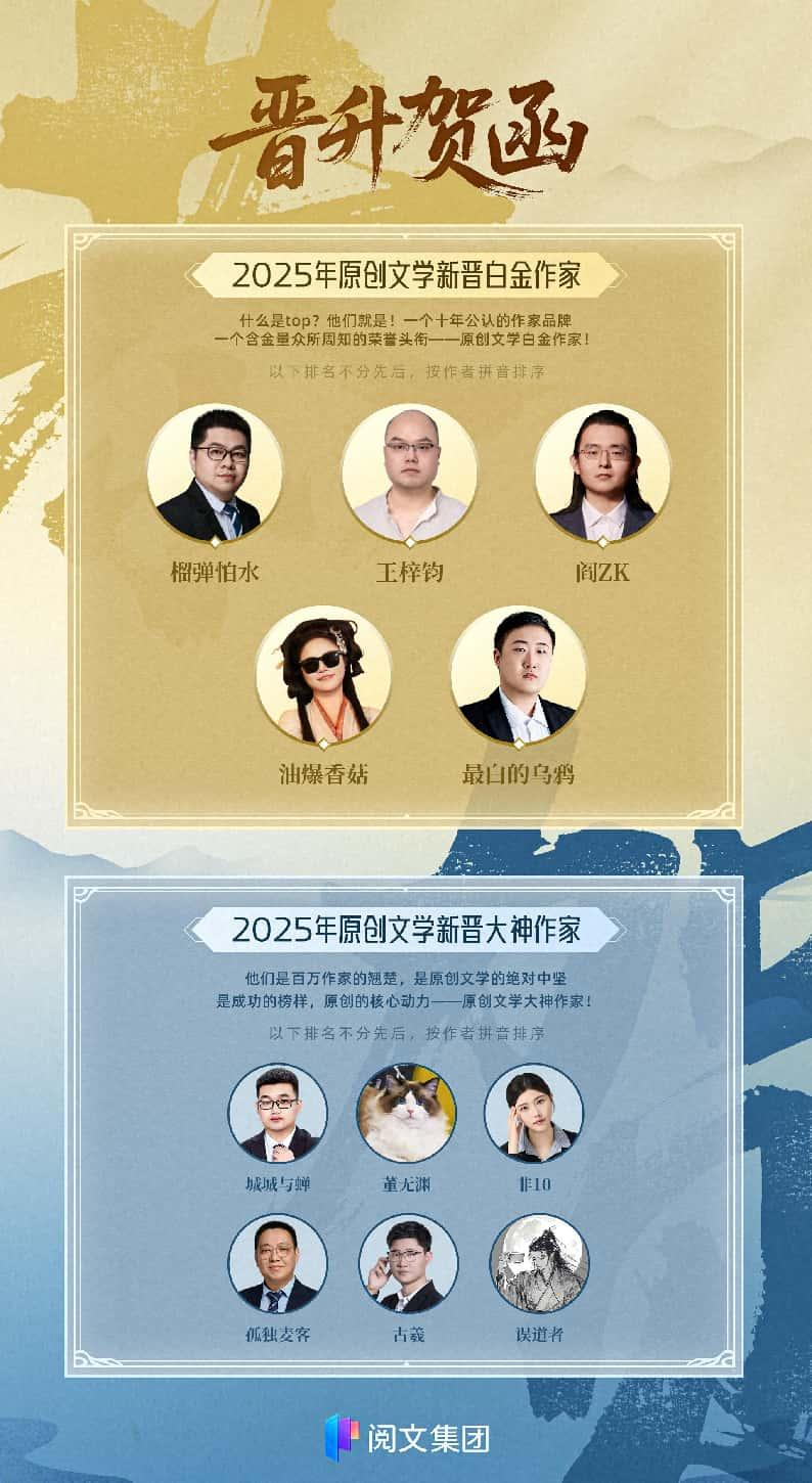 7月15日,閱文集團(tuán)發(fā)布2025年度“白金大神”作家名單,榴彈怕水、王梓鈞、閻ZK、油爆香菇、最白的烏鴉5名作者獲“白金作家”稱號,城城與蟬、董無淵、非10、孤獨(dú)麥客、古羲、誤道者6名作者獲“大神作家”稱號。