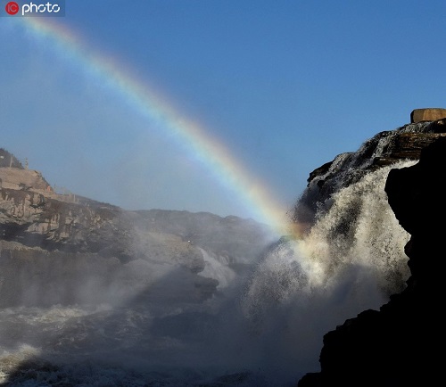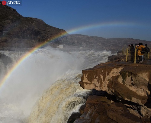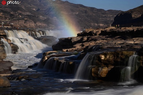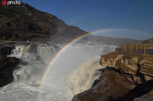 2019年11月25日,山西吉縣黃河壺口瀑布出現(xiàn)“彩虹通天”美景。入冬以來,隨著黃河干流水位回落,壺口瀑布落差加大,滾滾河水翻滾而下,飛濺起30多米高的水霧,在陽光的照射下,形成“彩虹通天”的美麗景象,讓游客流連忘返。呂桂明/攝