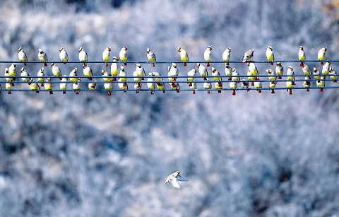 從去年10月下旬開始,有大量的小太平鳥進(jìn)入沁源縣境內(nèi),主要棲息在靈空山自然保護(hù)區(qū)、菩提山森林公園等地,到今年2月下旬,鳥群逐漸增多。本周以來,已有近萬只小太平鳥棲息于沁源縣境內(nèi),場(chǎng)面頗為壯觀,為綠色沁源又增添了一道亮麗的風(fēng)景。圖為3月28日沁源縣境內(nèi)拍攝的一群小太平鳥。