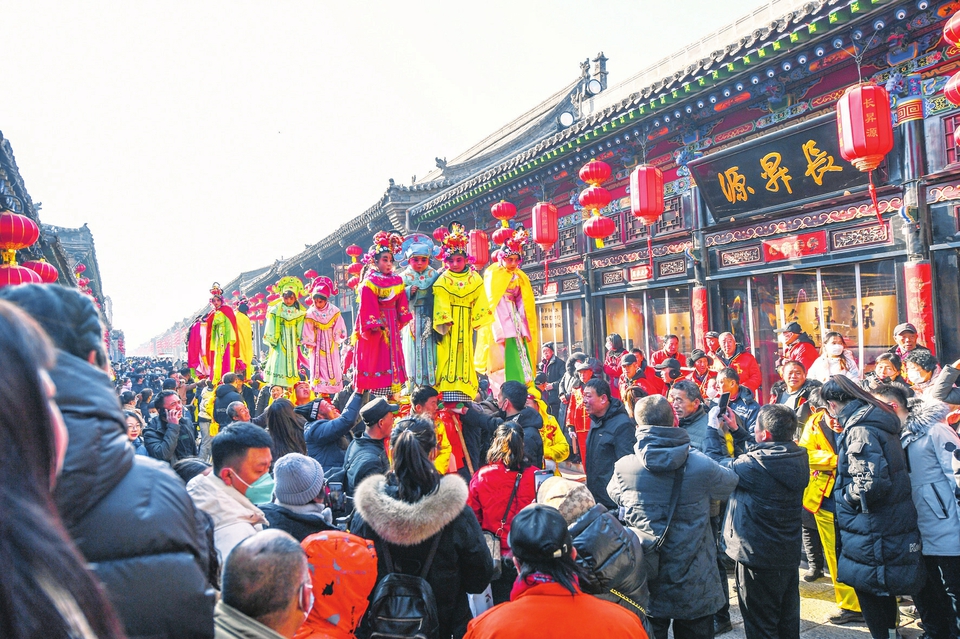 1月31日,游客在平遙古城觀看民俗社火表演。元宵節(jié)臨近,平遙古城內(nèi)舉行具有當(dāng)?shù)靥厣拿袼渍寡莼顒?,熱熱鬧鬧迎元宵。