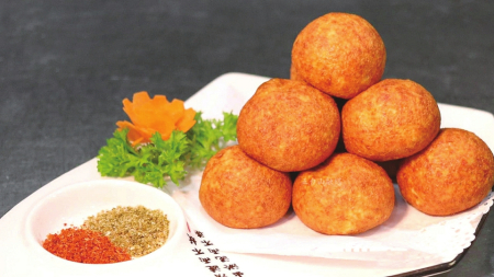 豆腐丸子精選五臺(tái)山鹵水豆腐,擠出多余水分,壓成細(xì)膩豆腐碎,加入佐料攪拌,揉成圓潤(rùn)緊實(shí)的丸子,蒸制后在麥芽糖水中定型再開(kāi)炸,外衣漸鍍“金甲”,內(nèi)里卻保持著豆腐的柔嫩本味。